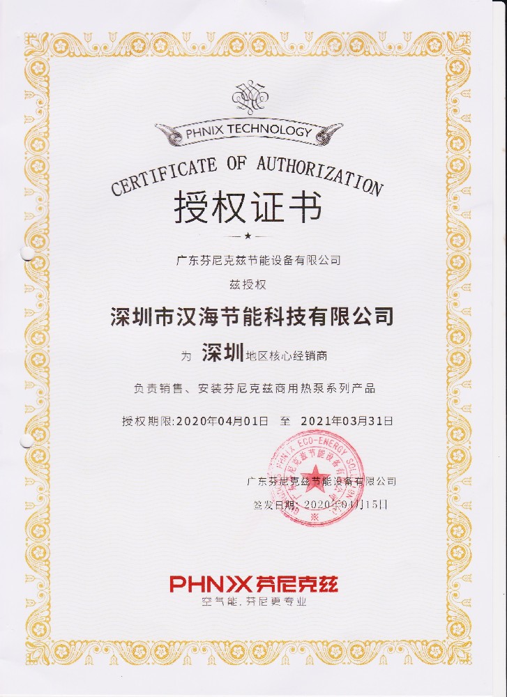 熱烈祝賀我公司獲得:芬尼克茲空氣源熱泵深圳地區核心經銷商授權證書。